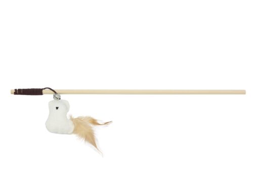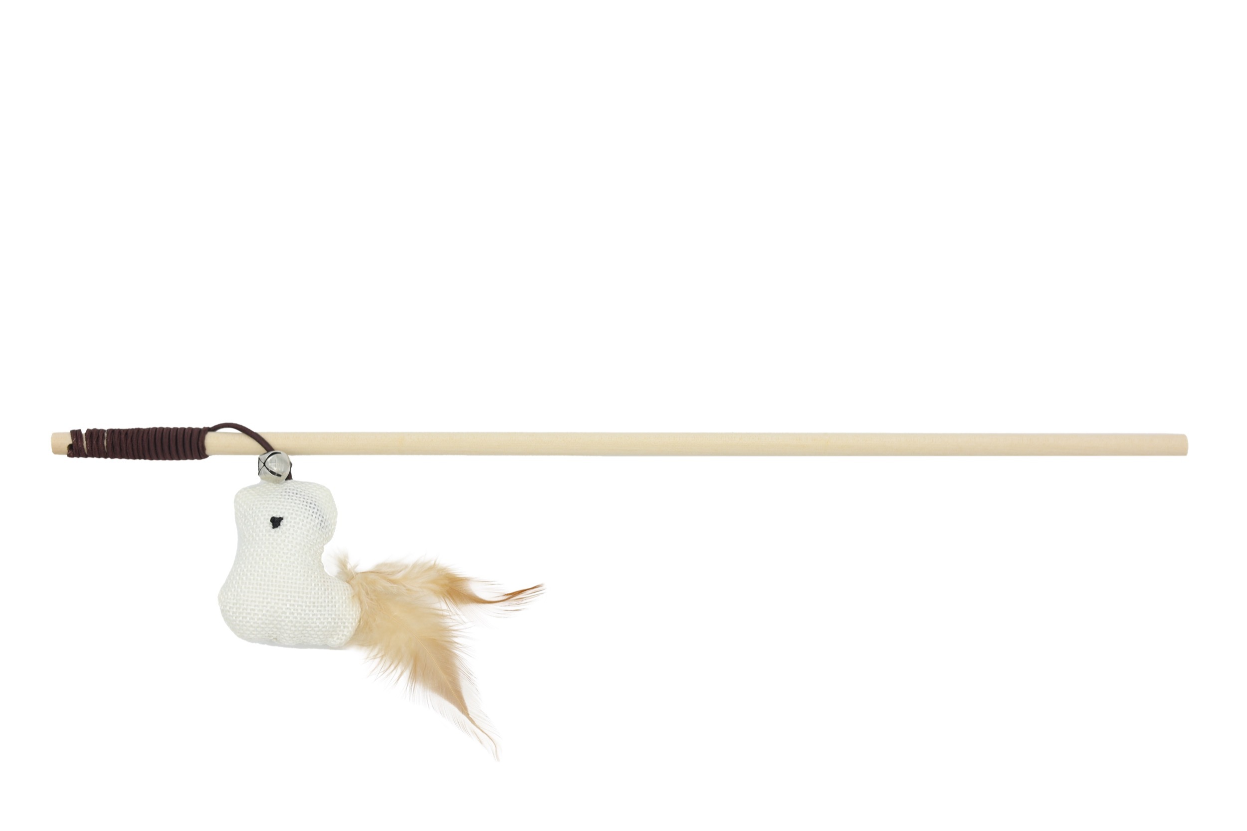 Sisalkangast täidetud mänguasi sule ja kellukesega puidust varre küljes.