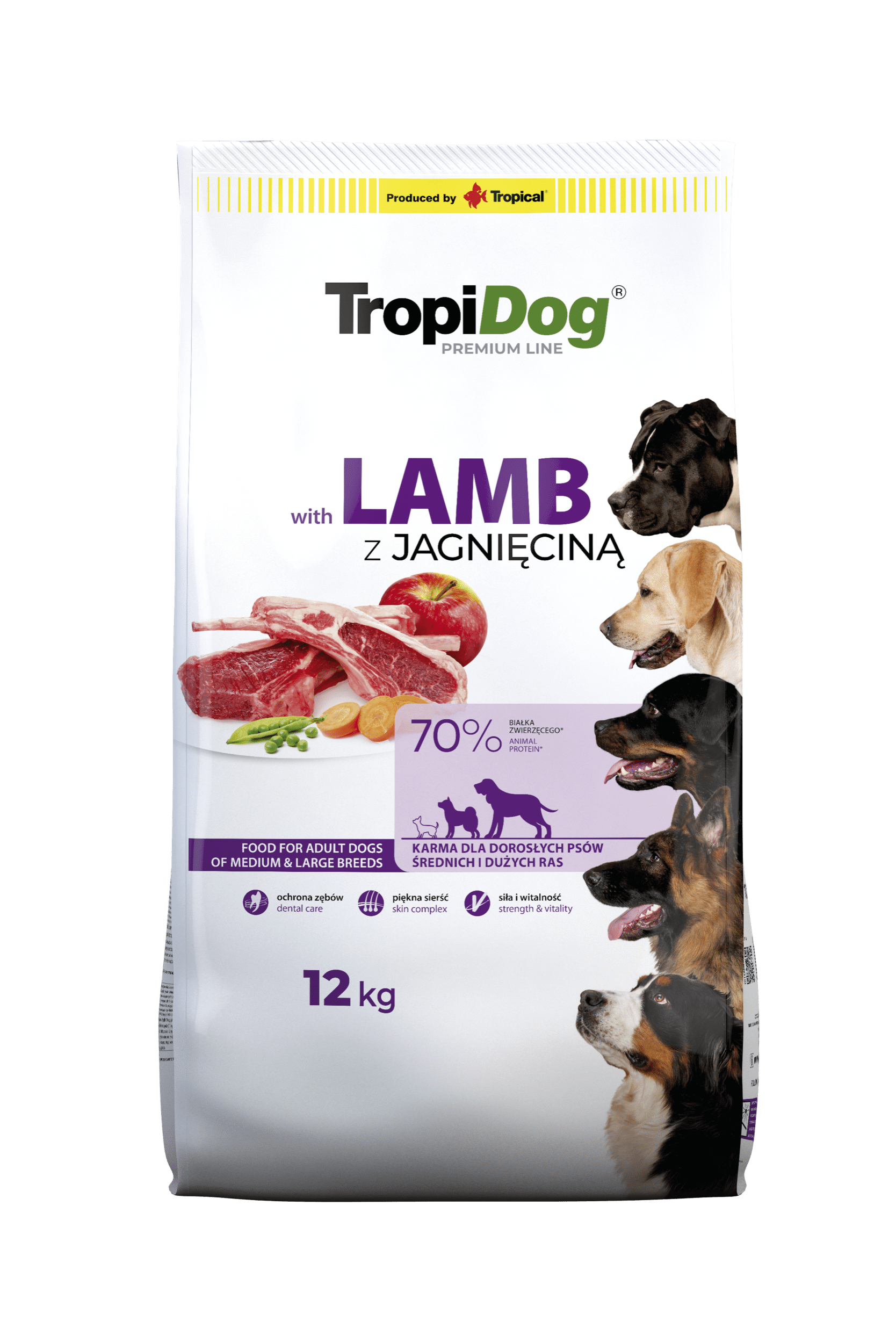 TropiDog lamba ja riisiga täissööt täiskasvanud keskmist (12 kuud ja vanemad) ja suurt tõugu (15 kuud ja vanemad) koertele.